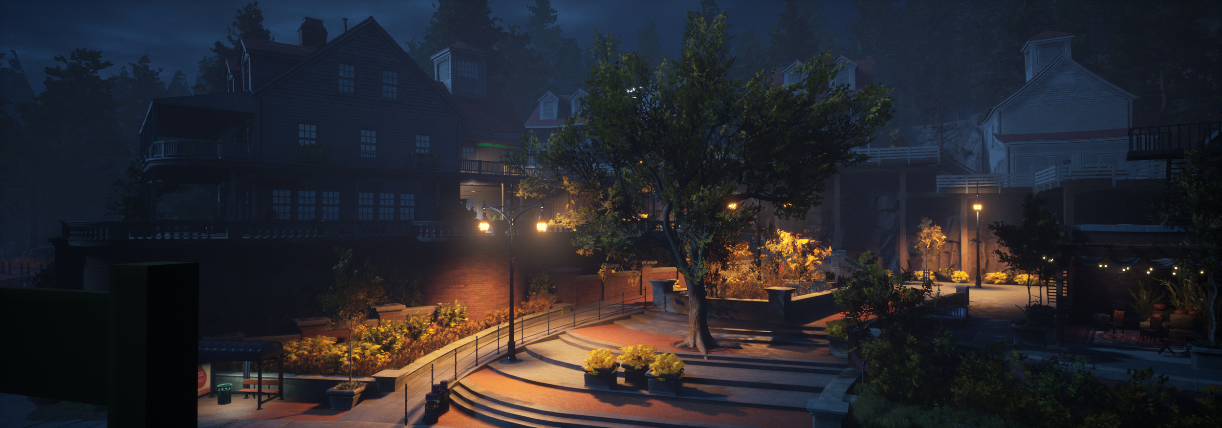 This space came together in about 5 weeks using mainly splines. I laid out the structure blockouts and our taleneted spline architect came back in with final buildings. My final work is mainlg the ground pathing and set dress after blockout.